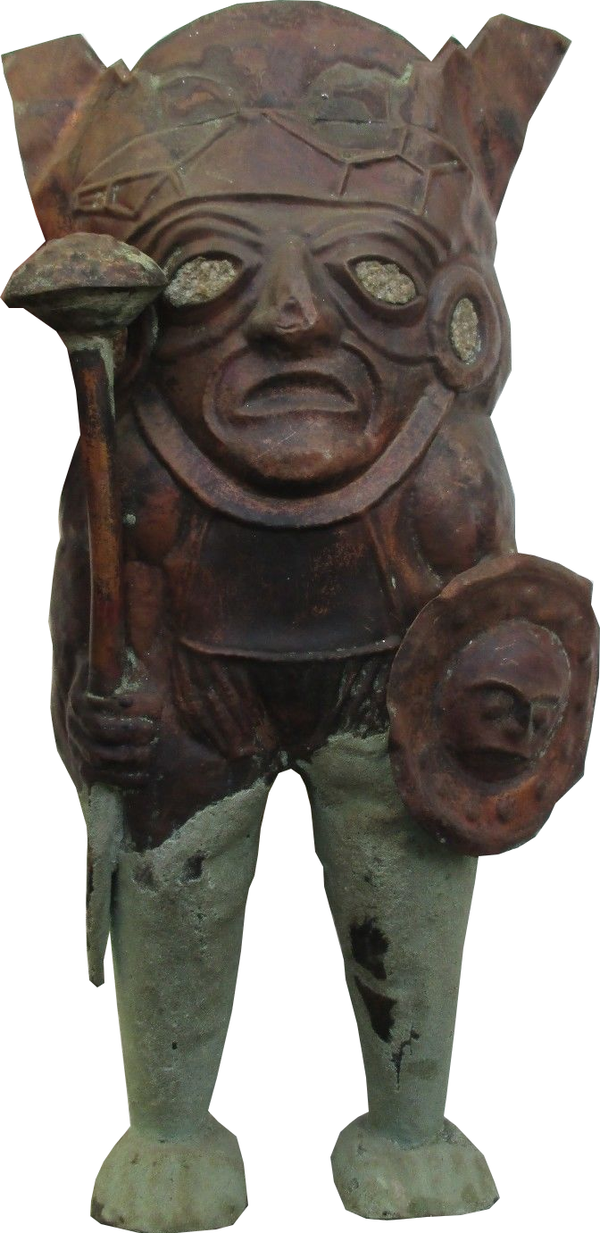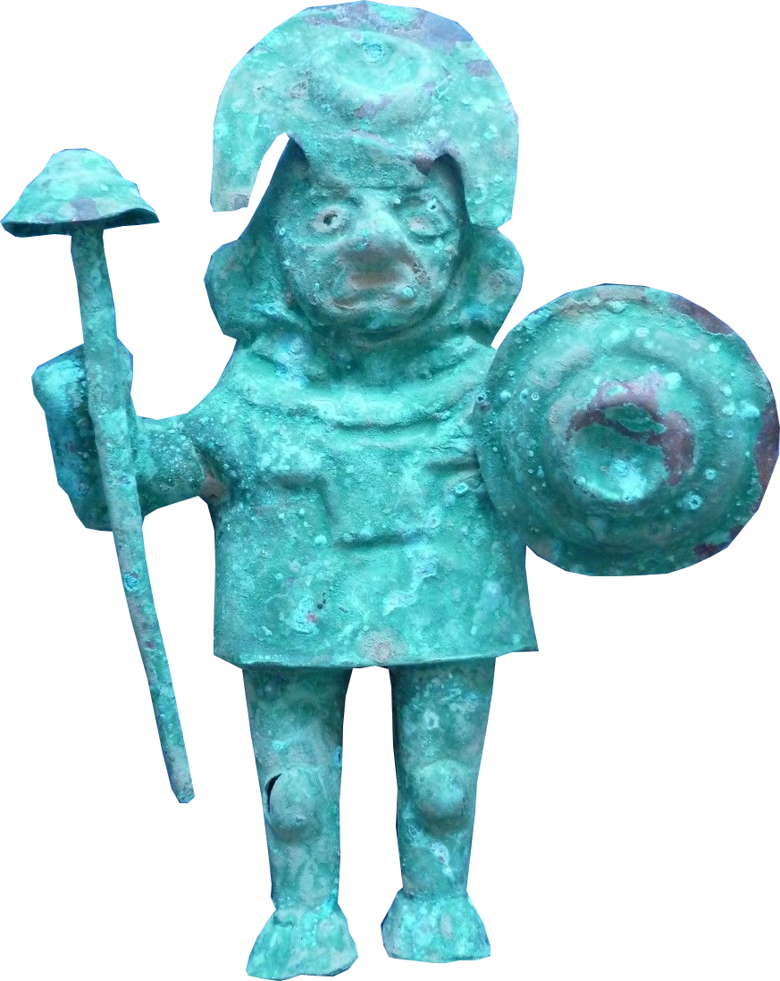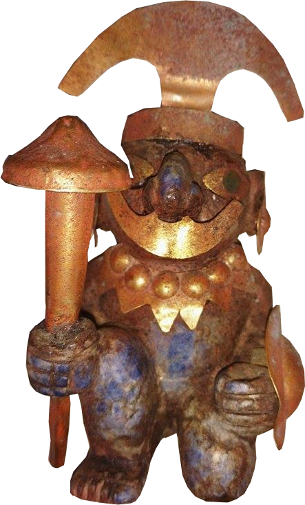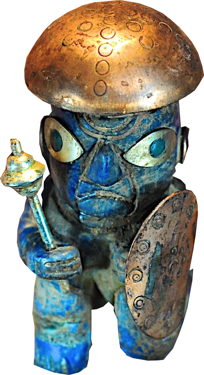 ![]() (86f) 10 Chumpis Idol Idols from Peru, metal, stone and terracotta, depict what scholars call the “warrior” figure, because he holds what appears to be a spear and a shield. We have already seen how both the spear and shield, in Greek iconography represented the occulted mushroom. The same thing occurs in Peruvian art (88b, c, d, e), and in one case at least, we find the “head-hunter” variety (88a). But is he really hunting heads, or is that a harvested mushroom being represented? ![]() ![]() (88b, c) Moche c. 100-700 AD ![]() ![]() (88d) Various South America |