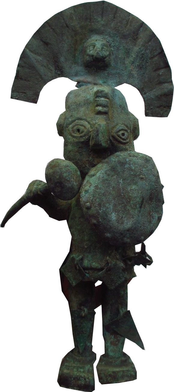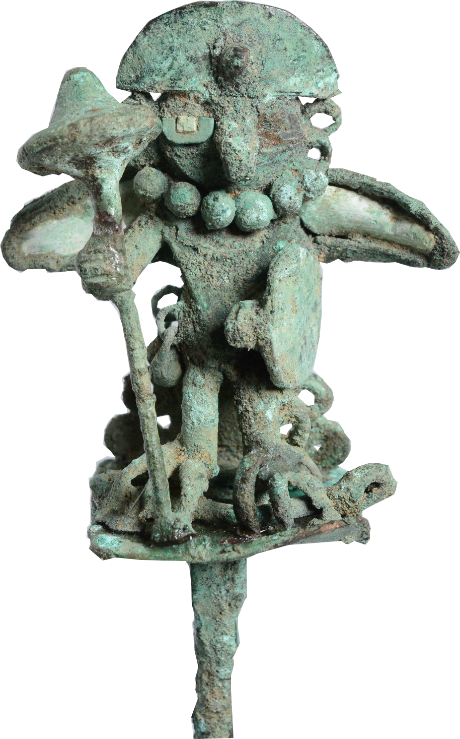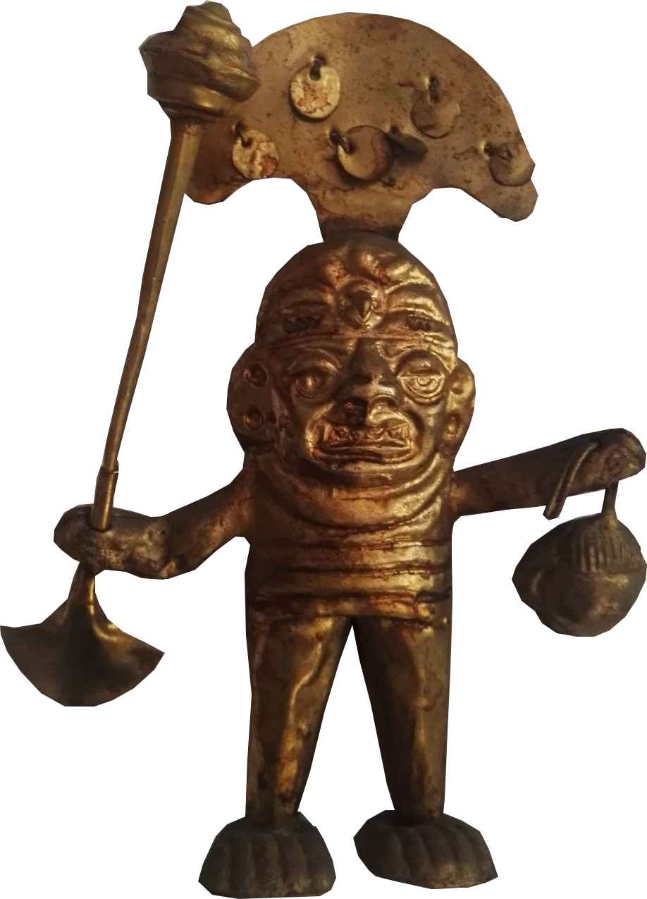 ![]() (86f) 10 Chumpis Idol Idols from Peru, metal, stone and terracotta, depict what scholars call the “warrior” figure, because he holds what appears to be a spear and a shield. We have already seen how both the spear and shield, in Greek iconography represented the occulted mushroom. The same thing occurs in Peruvian art (88b, c, d, e), and in one case at least, we find the “head-hunter” variety (88a). But is he really hunting heads, or is that a harvested mushroom being represented? ![]() ![]() (88b, c) Moche c. 100-700 AD ![]() ![]() (88d) Various South America |